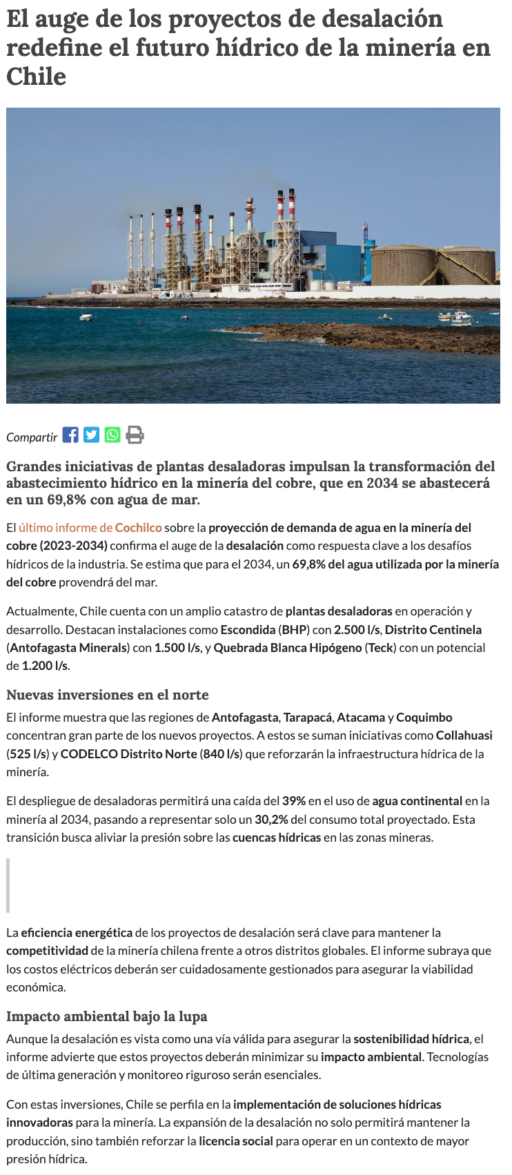 Minería del Cobre en Chile: 69.8% del Abastecimiento Hídrico Provenirá del Mar para 2034 Gracias a Nuevas Plantas Desaladoras - (redimin)
