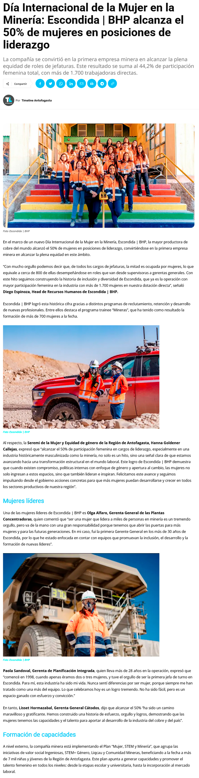 Escondida | BHP alcanza el 50% de mujeres en posiciones de liderazgo - (El Mercurio de Antofagasta)