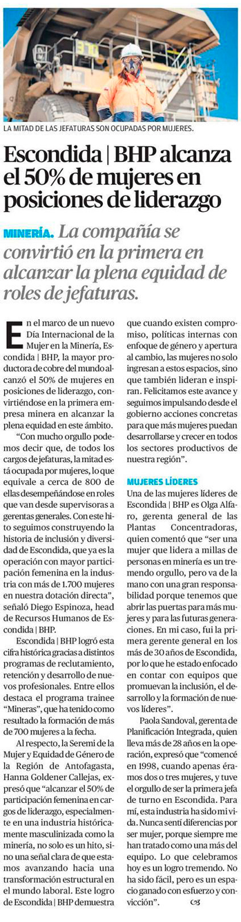 Escondida | BHP alcanza el 50% de mujeres en posiciones de liderazgo - (El Mercurio de Calama)