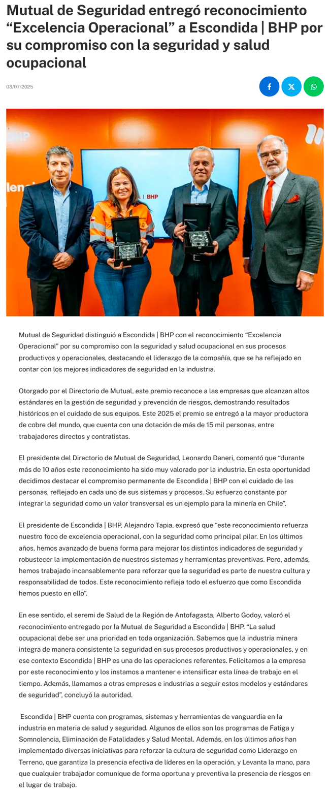 Mutual de Seguridad entregó reconocimiento “Excelencia Operacional” a Escondida | BHP por su compromiso con la seguridad y salud ocupacional - (timeline)