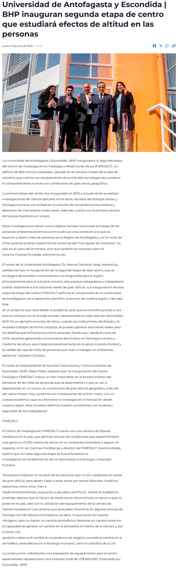 Universidad de Antofagasta y Escondida | BHP inauguran segunda etapa de centro que estudiará efectos de altitud en las personas - (madero.cl)