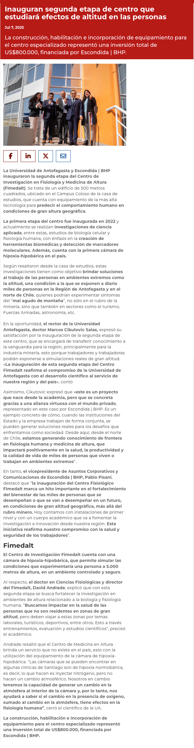 Universidad de Antofagasta y Escondida | BHP inauguran segunda etapa de centro que estudiará efectos de altitud en las personas - (madero.cl)