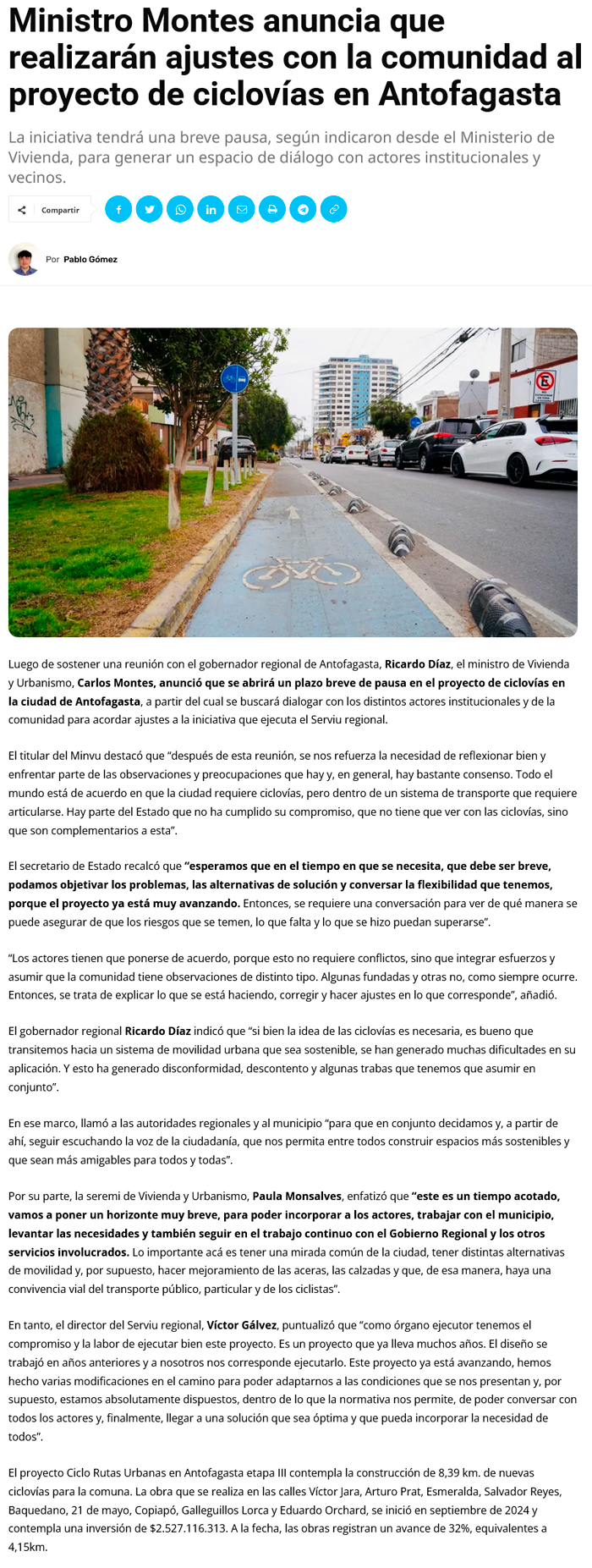 Tras múltiples críticas, Gobierno Regional y Minvu acuerdan pausar proyecto de ciclovías - (El Mercurio de Antofagasta)