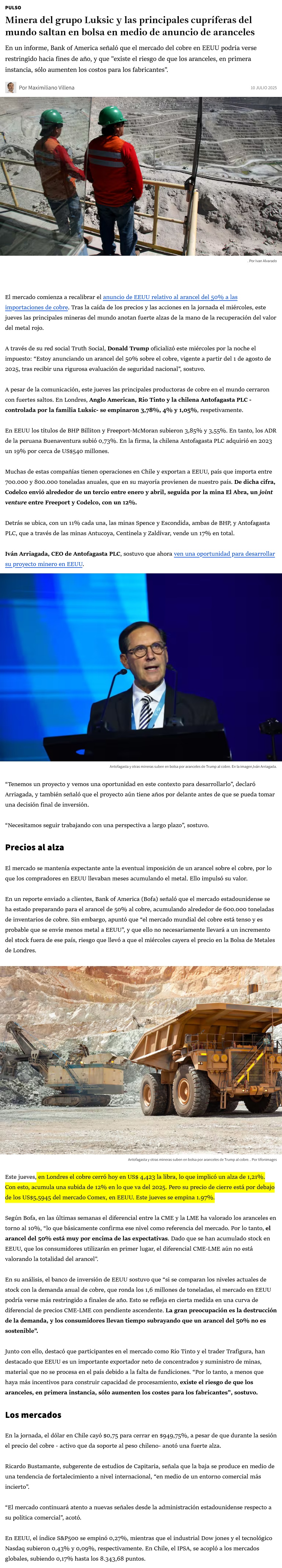 Acciones de Antofagasta PLC y BHP suben por anuncio de arancel del 50% al cobre en EE.UU. - (soyantofagasta)