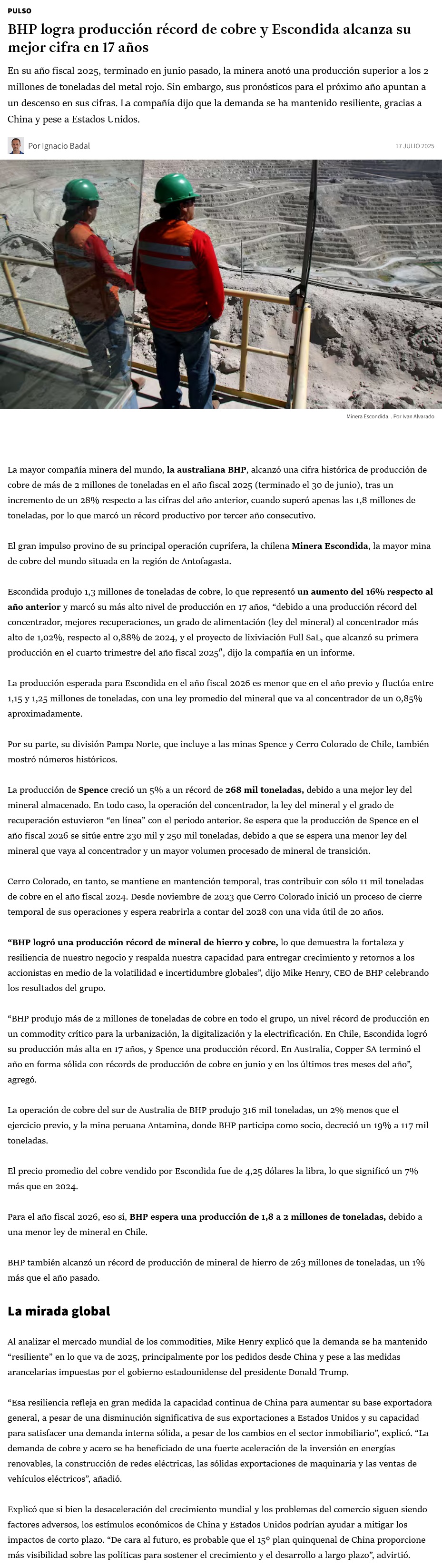 BHP logra producción récord de cobre y Escondida alcanza su mejor cifra en 17 años - (Pulso)