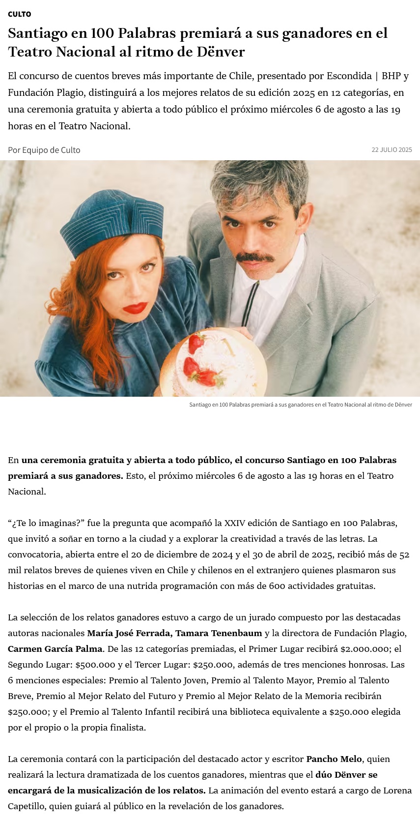 Santiago en 100 Palabras premiará a sus ganadores en el Teatro Nacional al ritmo de Dënver - (prensaeventos.cl)
