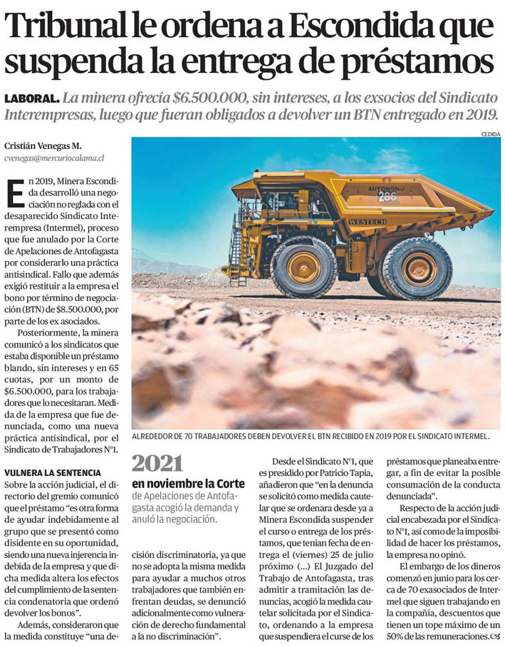 Tribunal le ordena a Escondida que suspenda la entrega de préstamos - (El Mercurio de Antofagasta)