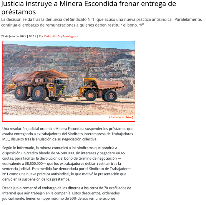 Tribunal ordena a Minera Escondida suspender entrega de préstamo solidario a trabajadores afectados por embargo de bono - (DF Online)