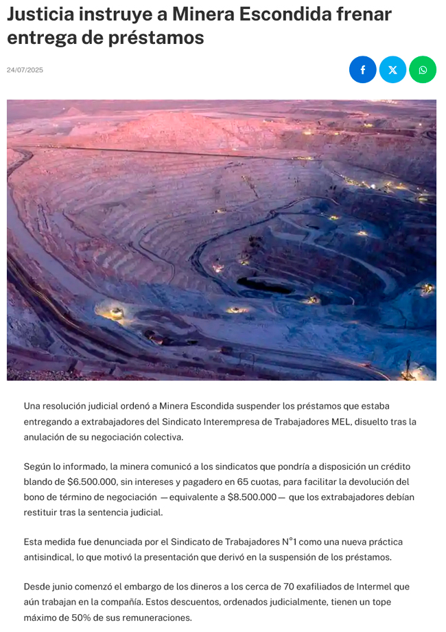 Tribunal ordena a Minera Escondida suspender entrega de préstamo solidario a trabajadores afectados por embargo de bono - (DF Online)