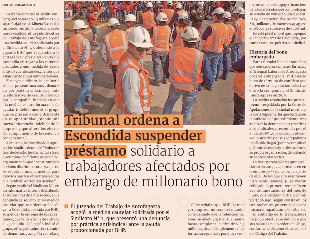 Tribunal ordena a Minera Escondida suspender entrega de préstamo solidario a trabajadores afectados por embargo de bono - (DF Online)