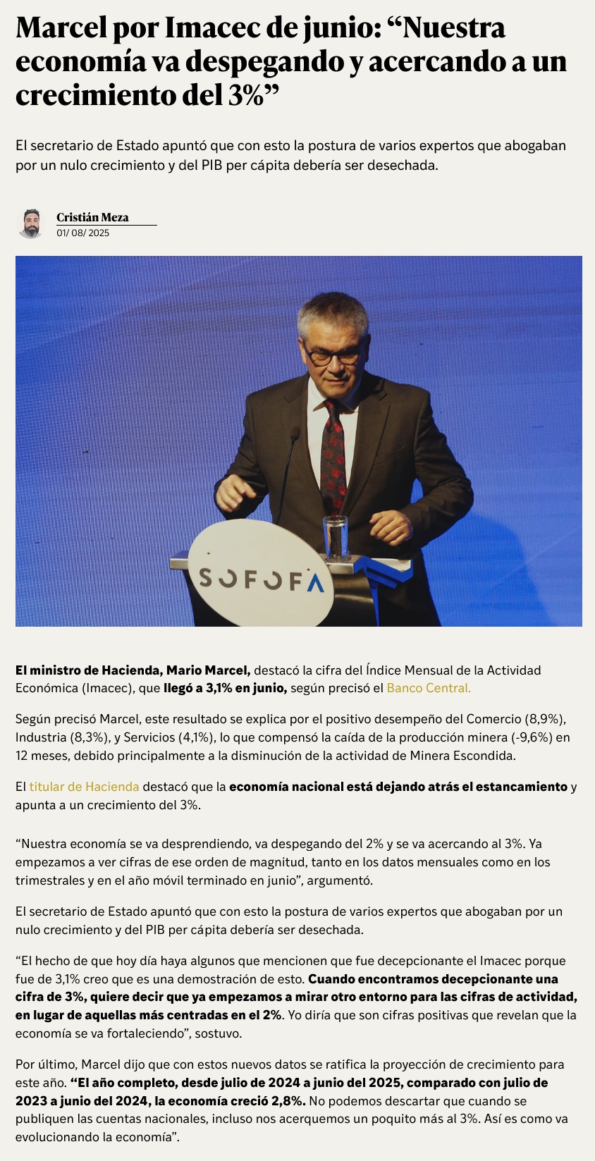 Ministro Marcel por Imacec de 3,1% en junio: “Nuestra economía va despegando del 2% y se va acercando a un crecimiento del 3%” - (Estrategia)
