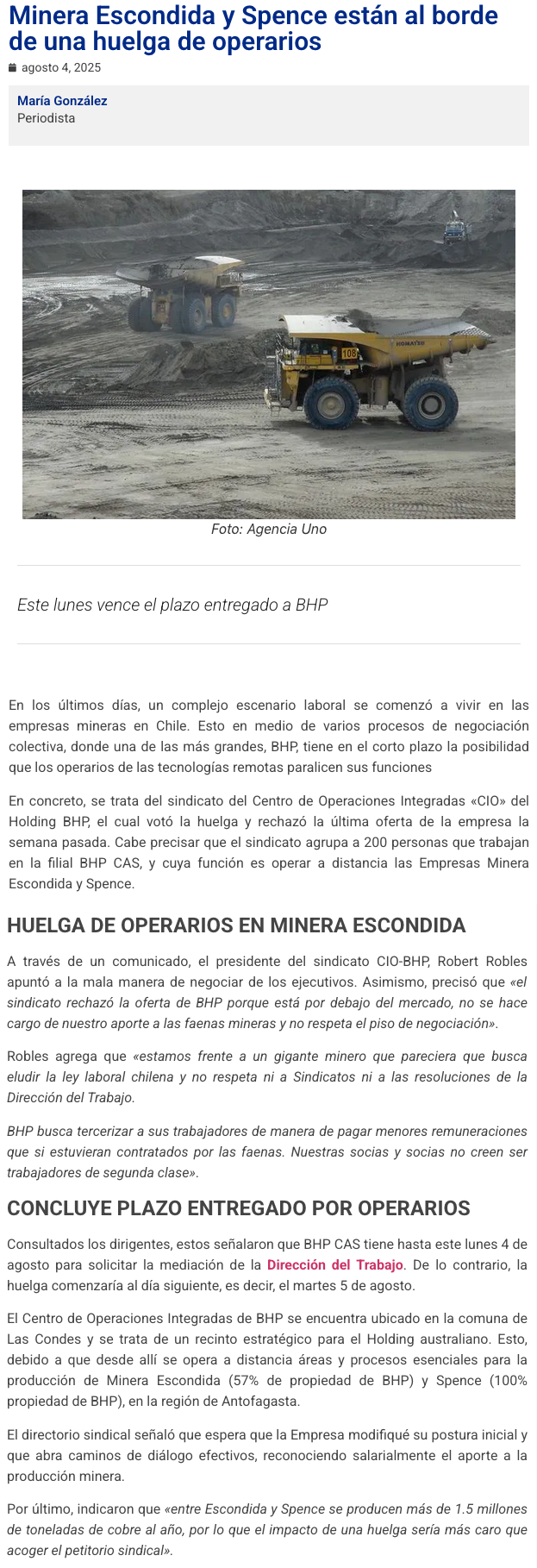 Sindicato CIO de BHP vota huelga con 97% de apoyo: posible paralización total de Escondida y Spence - (elperiodista.cl)