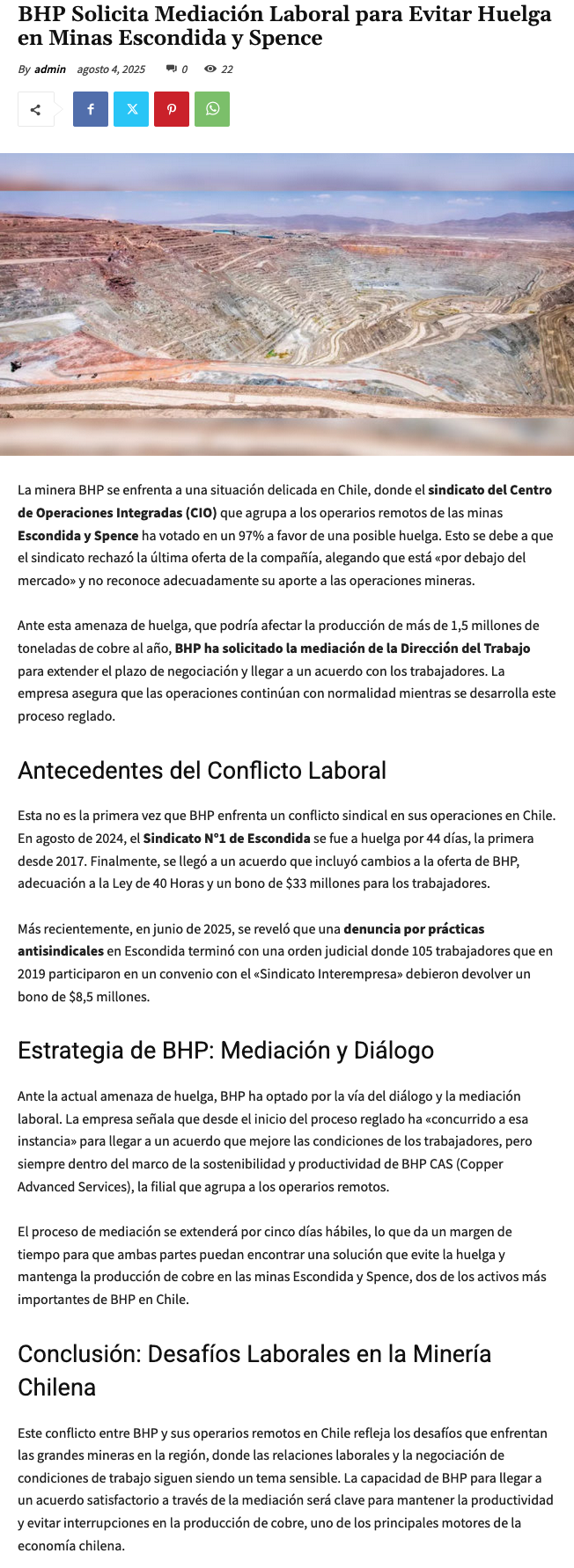 Sindicato CIO de BHP vota huelga con 97% de apoyo: posible paralización total de Escondida y Spence - (elperiodista.cl)