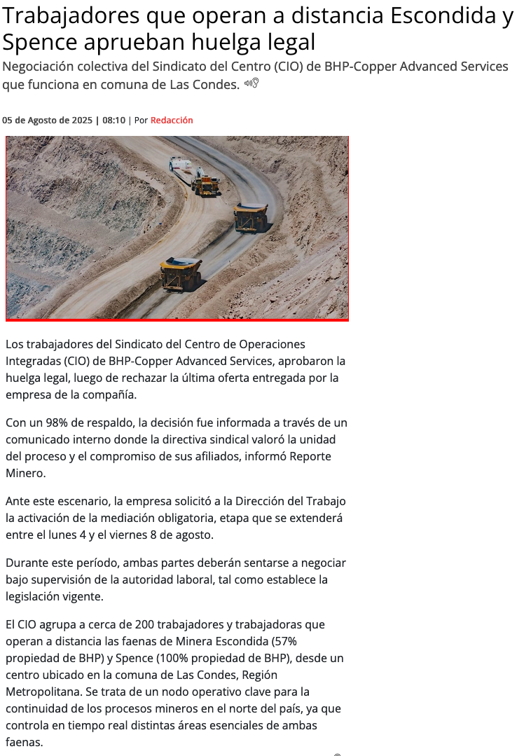 Sindicato CIO de BHP inician etapa de mediación obligatoria tras aprobar huelga con 98% de respaldo - (portalinnova.cl)