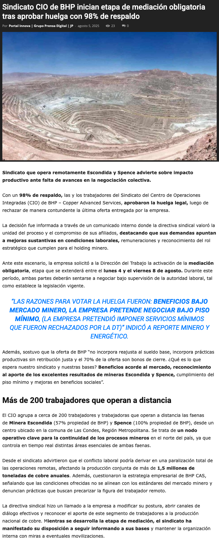 Trabajadores que operan a distancia Escondida y Spence aprueban huelga legal - (soyantofagasta)