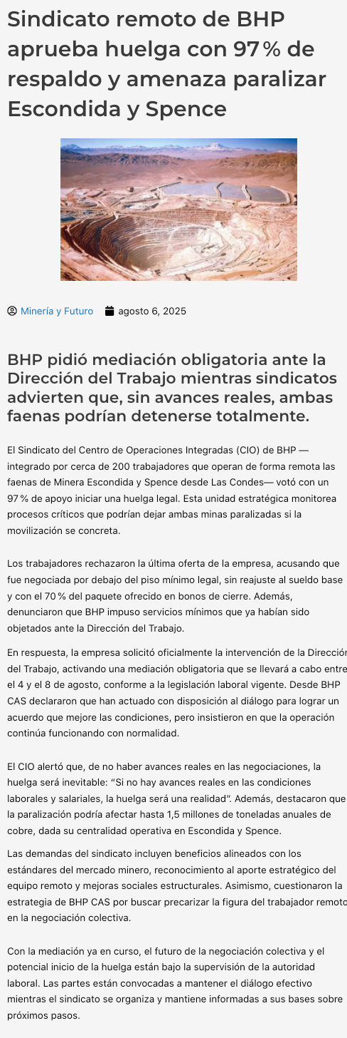 Posible huelga en unidad clave de BHP suma 97% de apoyo y tensiona operaciones de Escondida y Spence - (radioamigavallenar.cl)
