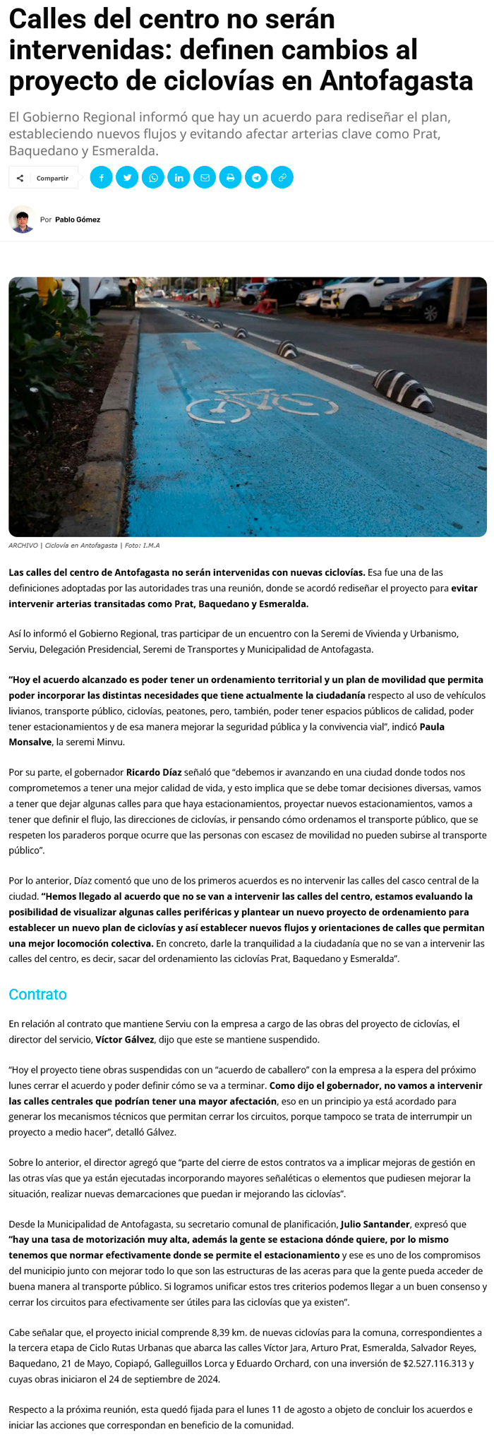 Fin a la polémica: Autoridades acuerdan cancelar la construcción de ciclovías en calles del centro de la capital regional - (El Mercurio de Antofagasta)