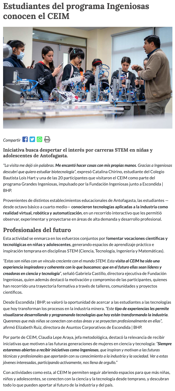 Estudiantes del programa Ingeniosas conocen el CEIM - (calamaenlinea.cl)
