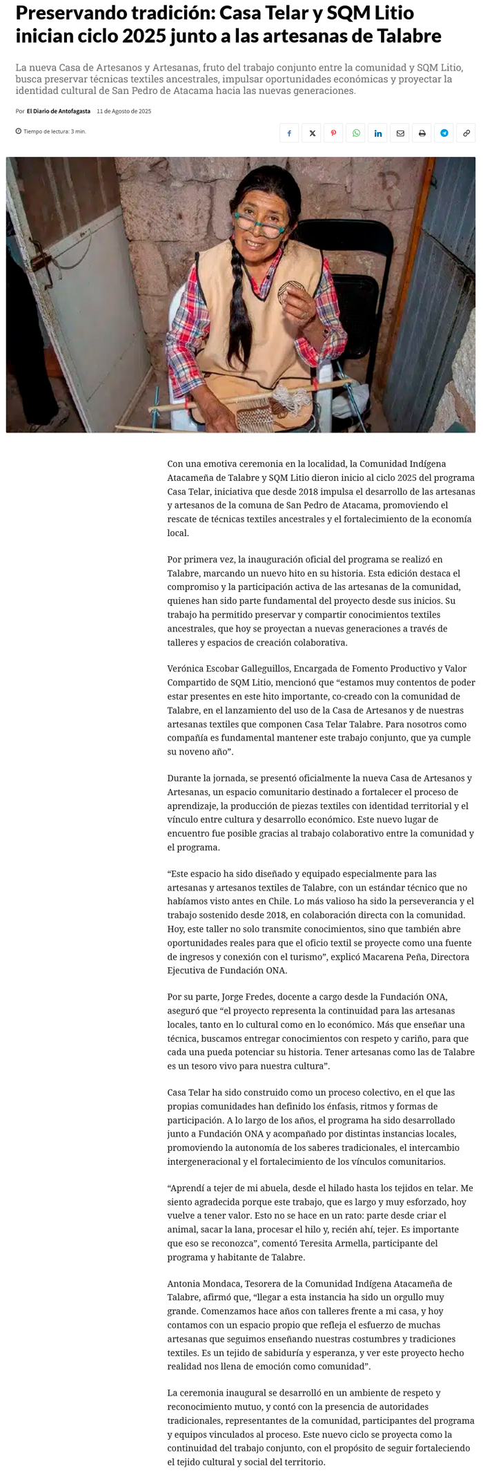 Casa Telar y SQM Litio dieron inicio a su ciclo de las artesanas de Talabre - (La Estrella)