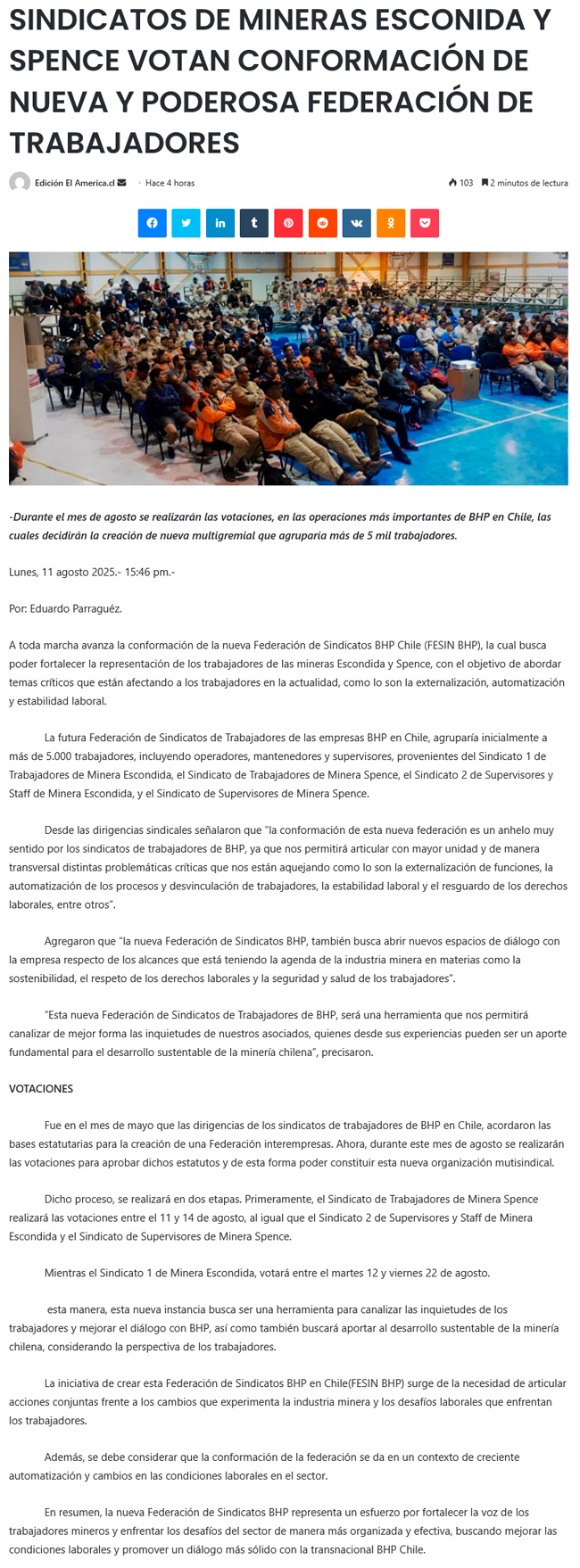 Sindicatos de mineras Escondida y Spence votan conformación de nueva Federación de Trabajadores - (regionalista.cl)