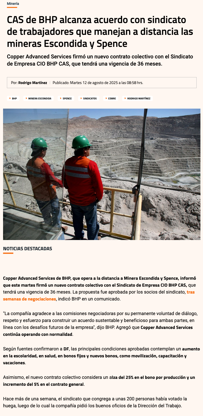 BHP Copper Advanced Services y Sindicato CIO BHP CAS firman nuevo contrato colectivo por 36 meses - (timeline)
