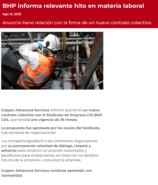 BHP Copper Advanced Services y Sindicato CIO BHP CAS firman nuevo contrato colectivo por 36 meses - (timeline)