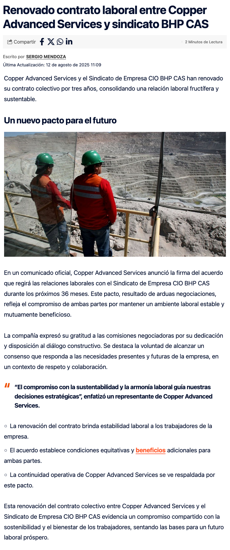 Copper Advanced Services firma nuevo contrato colectivo con Sindicato CIO BHP CAS - (mineriayfuturo.cl)
