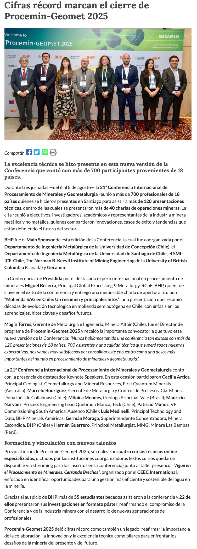 Cifras récord marcan el cierre de Procemin-Geomet 2025: procesamiento de minerales y geometalurgia en el centro del debate - (mvcomunicaciones.cl)