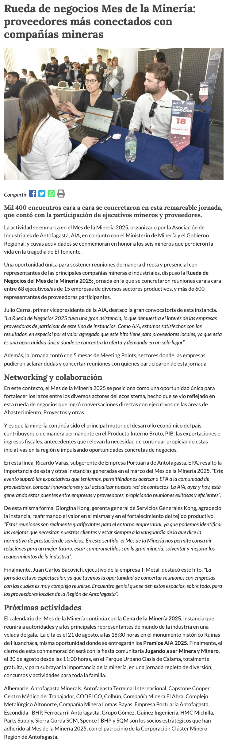 Mes de la Minería: Rueda de Negocios impulsa vínculo entre proveedores y compañías productoras - (mch.cl)