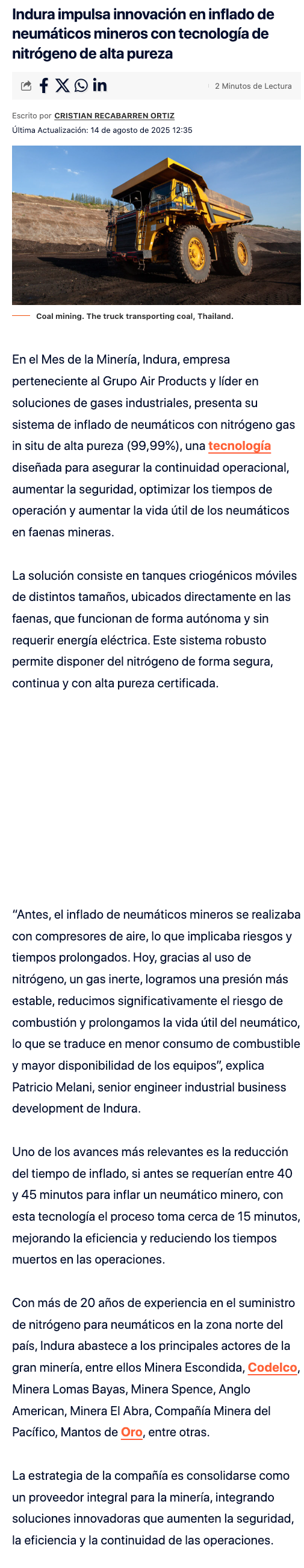 Indura impulsa innovación en inflado de neumáticos mineros con tecnología de nitrógeno de alta pureza - (portalinnova.cl)