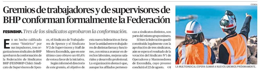 Gremios de trabajadores y de supervisores de BHP confirman formalmente la Federación - (El Mercurio de Antofagasta)