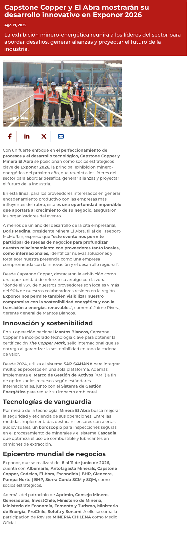 Capstone Copper y El Abra llegarán como referentes de innovación a Exponor 2026 - (soychile)