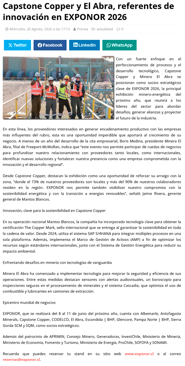 Capstone Copper y El Abra, referentes de innovación en EXPONOR 2026 - (regionesnoticias.cl)