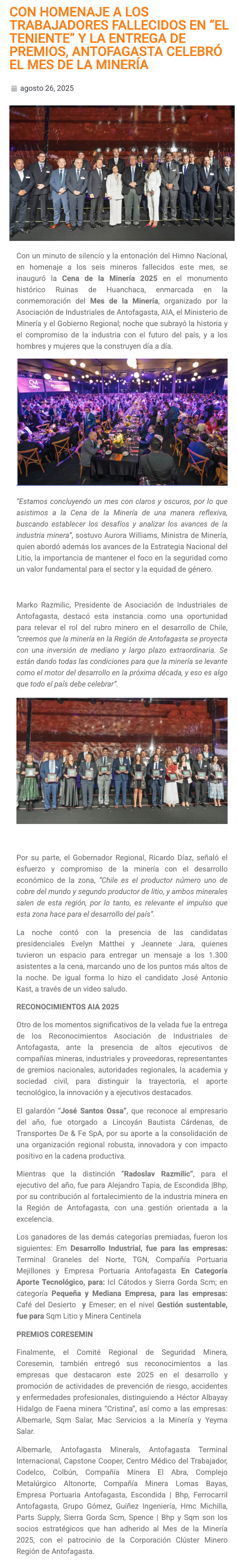 Homenaje a los trabajadores de la industria marcó la Cena de la Minería 2025 en Antofagasta - (guiaminera.cl)
