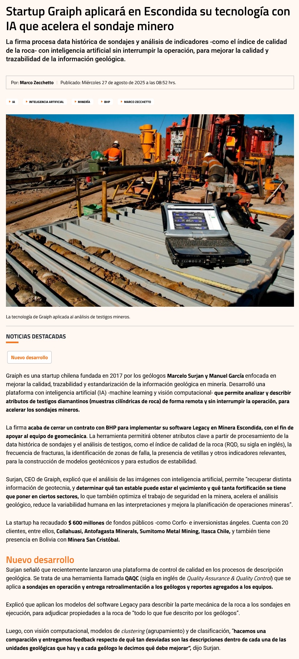 Startup Graiph aplicará en Escondida su tecnología con IA que acelera el sondaje minero - (Diario Financiero)