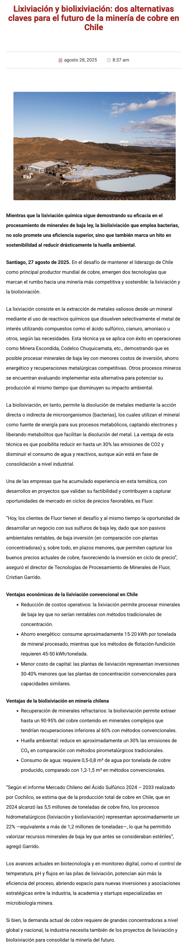Lixiviación y biolixiviación: alternativas claves para el futuro de la minería del cobre en Chile - (mineriayfuturo.cl)