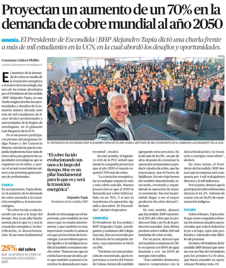 Proyectan un aumento de un 70% en la demanda de cobre mundial al año 2050 - (El Mercurio de Calama)