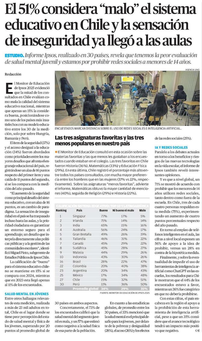 El 51% considera "malo" el sistema educativo en Chile y la sensación de inseguridad ya llegó a las aulas - (El Mercurio de Antofagasta)