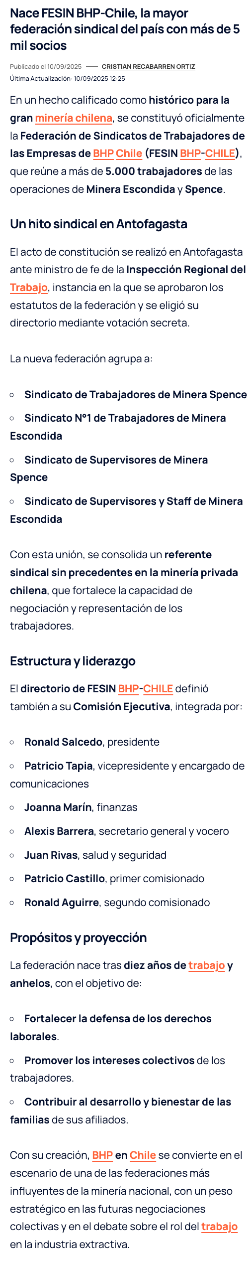 Nueva federación de sindicatos BHP busca sumar a contratistas y superar los 25 mil socios - (El Mercurio de Calama)