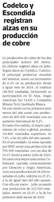 Codelco y Escondida muestran avances en producción de cobre en julio - (redimin)