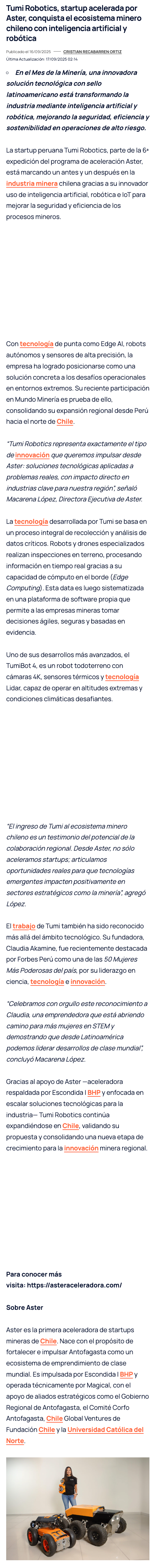 Tumi Robotics, startup acelerada por Aster, conquista el ecosistema minero chileno con inteligencia artificial y robótica - (portalinnova.cl)