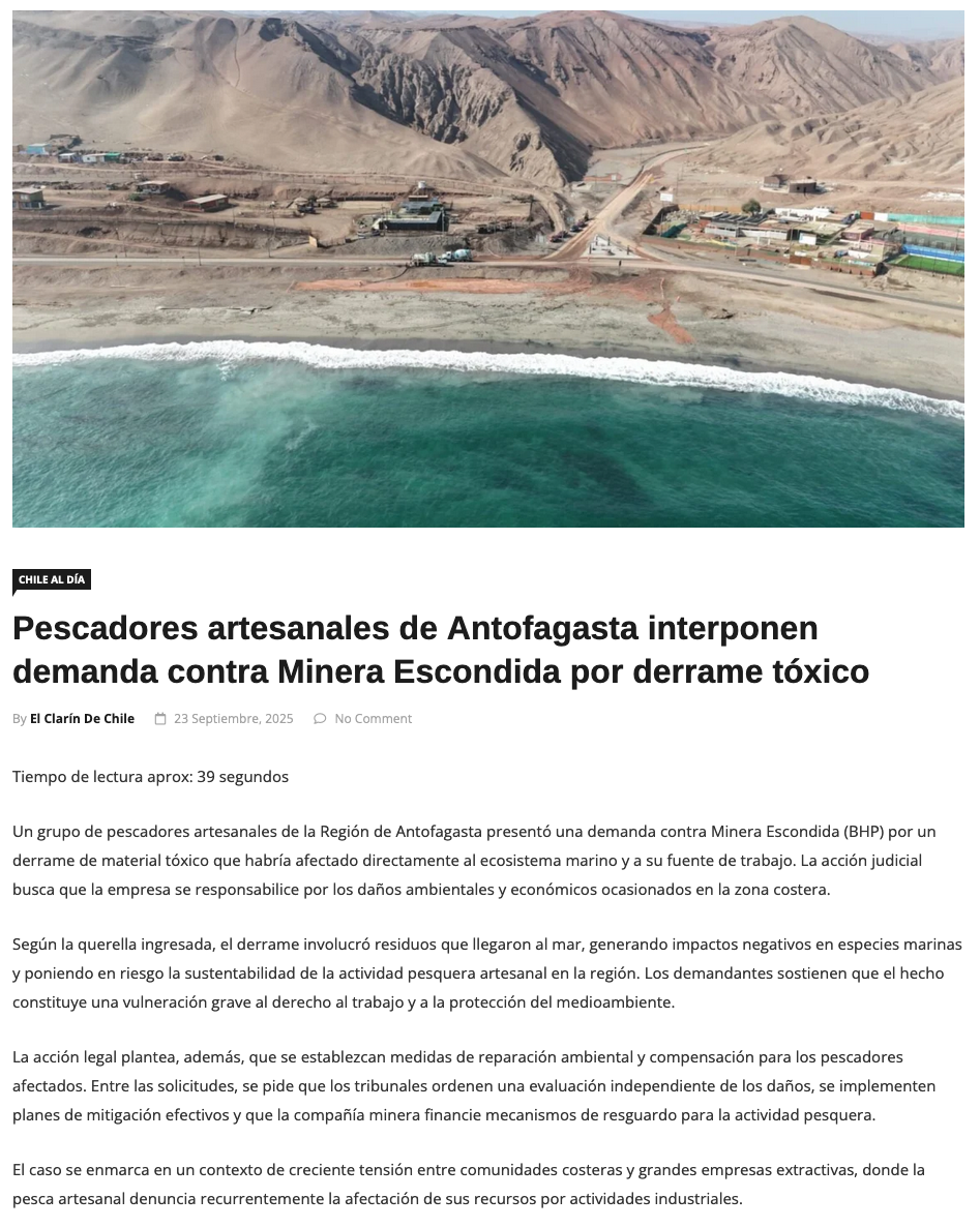 Pescadores artesanales de Antofagasta interponen demanda contra Minera Escondida por derrame tóxico - (antofagastanoticias)