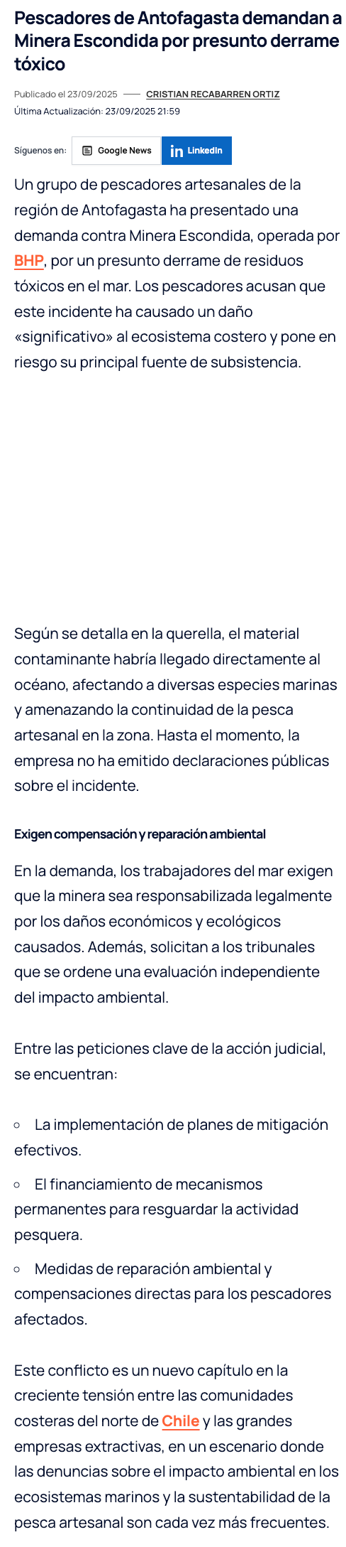 Pescadores artesanales de Antofagasta demandan a Minera Escondida tras derrame que afectó el borde costero - (regionalista.cl)