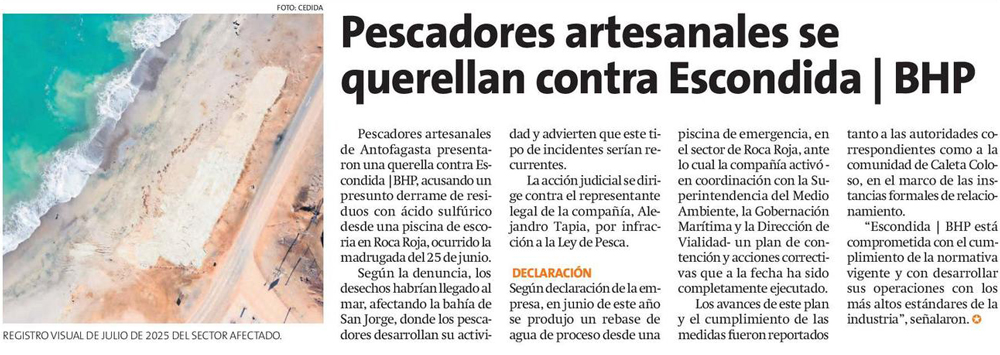 Pescadores artesanales de Antofagasta demandan a Minera Escondida tras derrame que afectó el borde costero - (regionalista.cl)