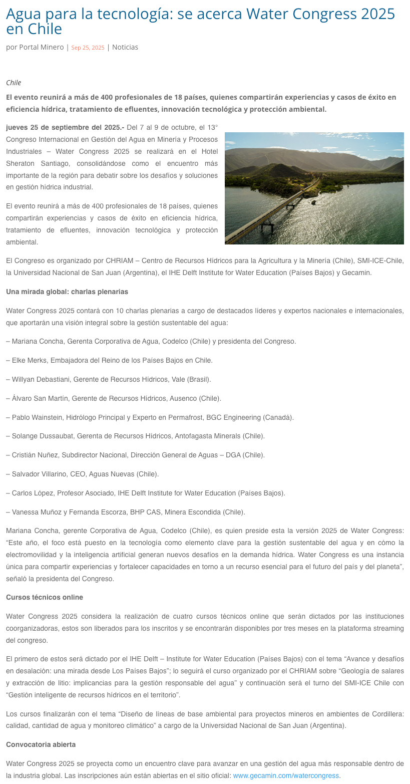 Tecnologías para el agua – Agua para la tecnología: se acerca Water Congress 2025 en Chile - (nuevaminería online)