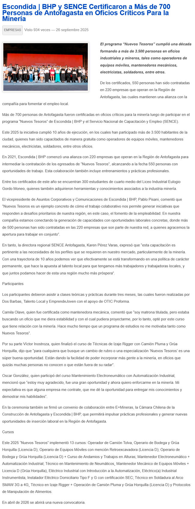 Minera Escondida / BHP y Sence certificaron a más de 700 personas en oficios críticos en la minería - (revistacrisol.cl)