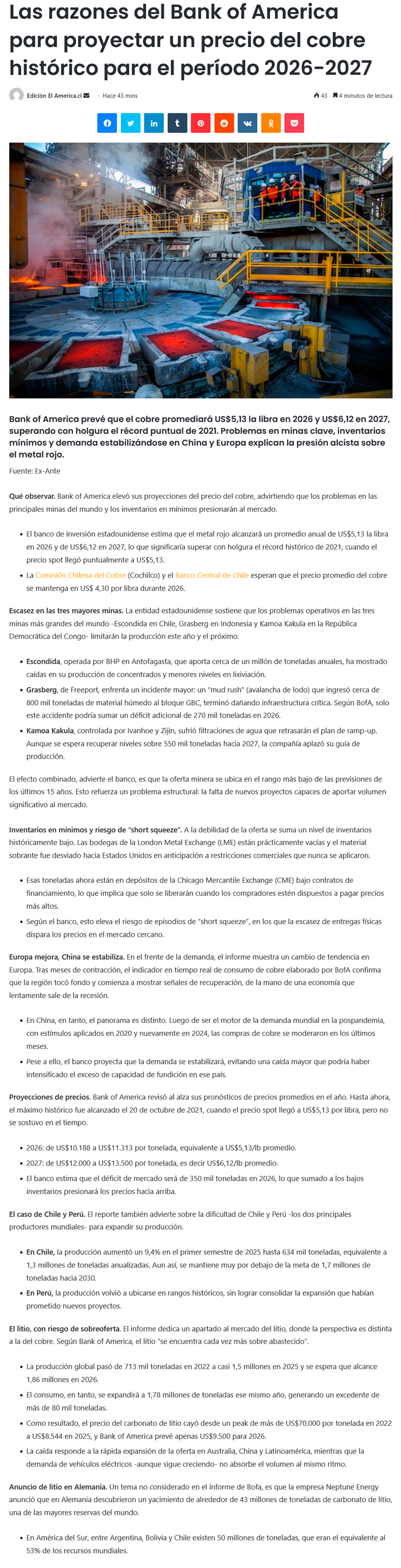 Las razones del Bank of America para proyectar un precio del cobre histórico para el período 2026-2027 - (ex-ante.cl)