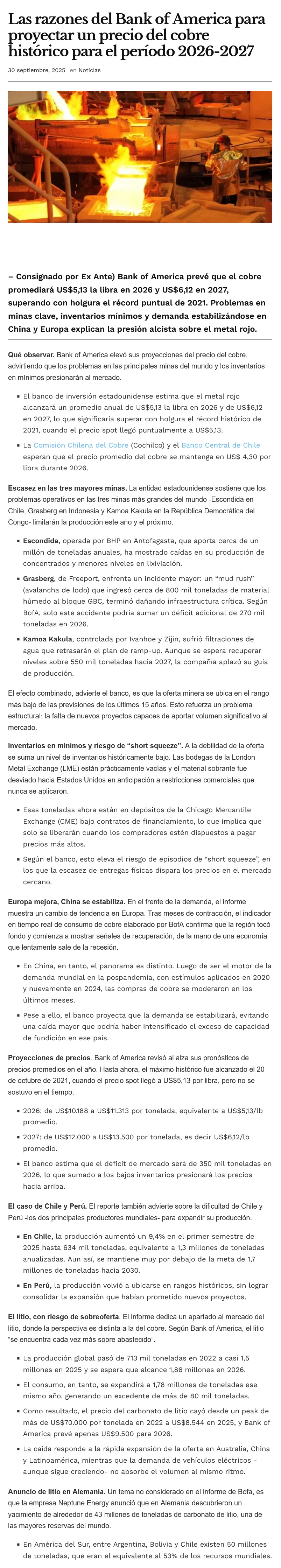 Bank of America proyecta precio récord del cobre en 2026 y 2027 ante escasez global y baja en inventarios - (eldiariodesantiago.cl)