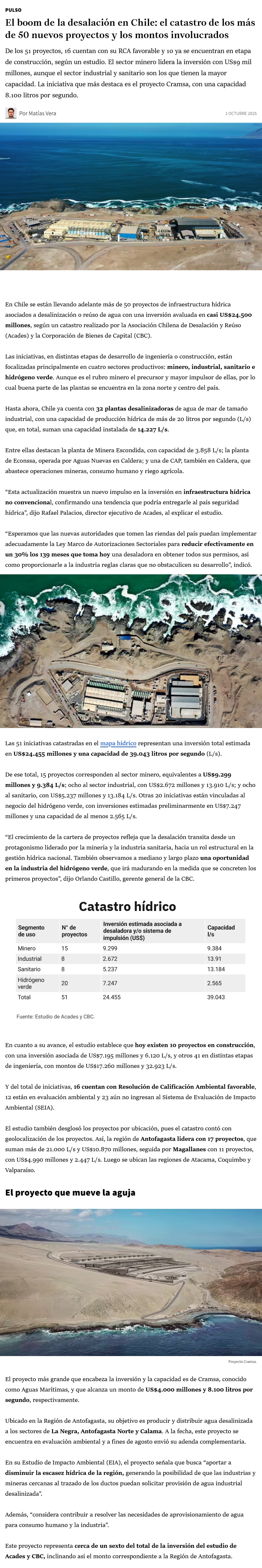 Catastro de desalación en Chile: se desarrollan 51 nuevos proyectos avaluados en US$24 mil millones - (Pulso)