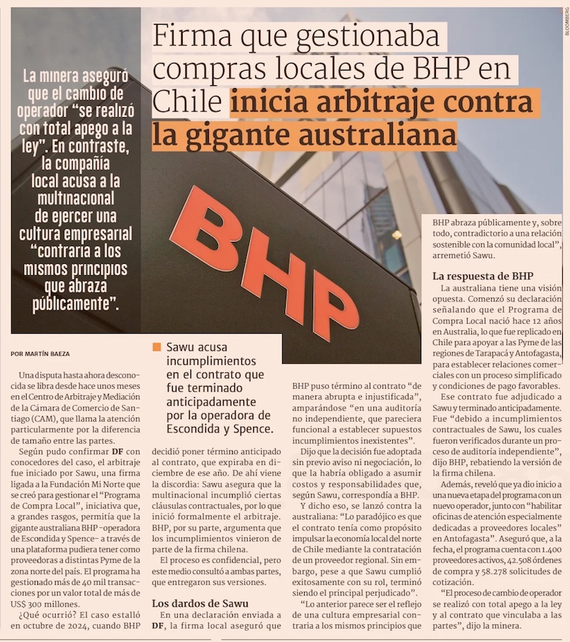 Firma chilena que gestionaba compras locales de BHP se lanza contra la gigante australiana e inicia arbitraje acusando incumplimientos contractuales - (DF Online)